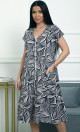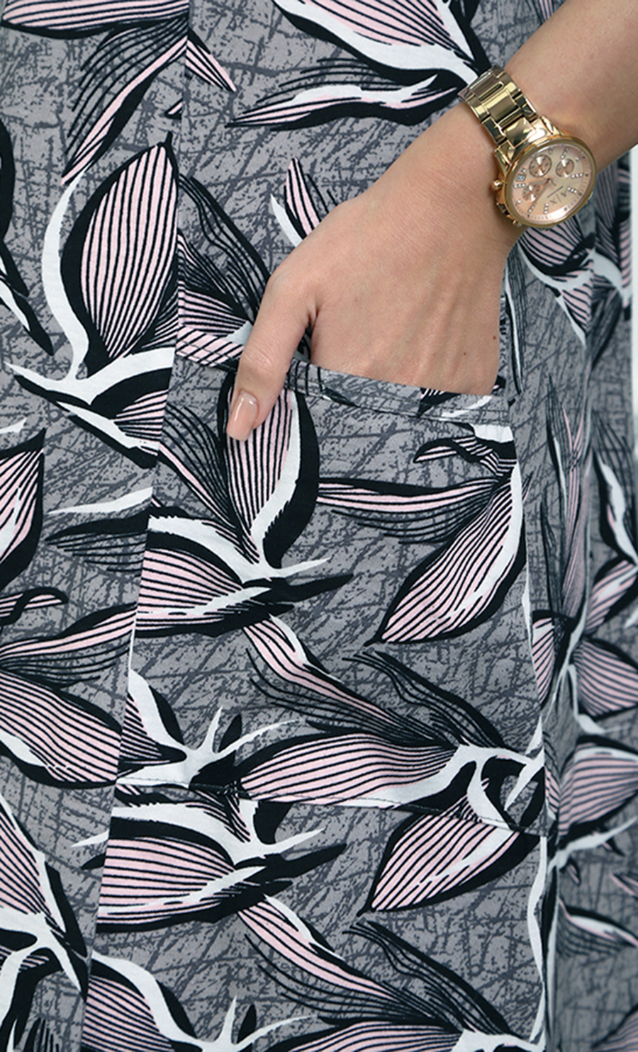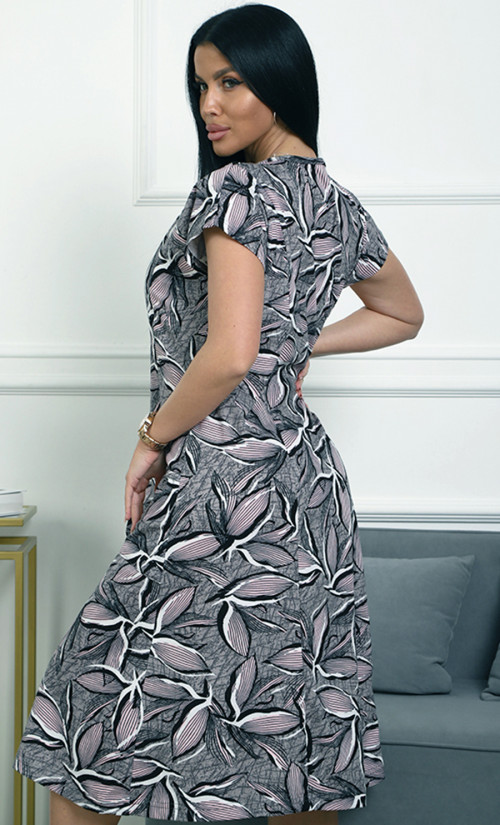 Цвет: серо-чёрный с принтом больших листьев и лёгкими розовыми оттенками