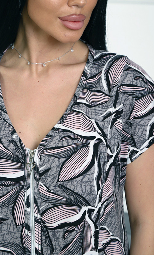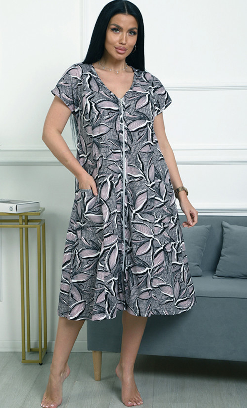 Халат СИ-77⁄4 выполнен из кулирки 100% хлопка — мягкого, натурального и дышащего материала. Модель с короткими рукавами и застёжкой на молнию спереди создаёт удобный и стильный домашний образ. Принт с листьями придаёт изделию элегантность и современный вид.