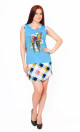 Туника полуприлегающего силуэта, длиной до колена. Отрезное по нижней части переда и спинки. Вырез горловины округлой формы. Горловина и проймы обработаны широкой окантовкой.Отрезные части изделия и отделка выполнены из трикотажа "в клетку". По центру переда яркий принт.