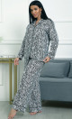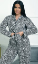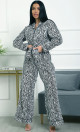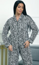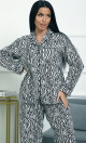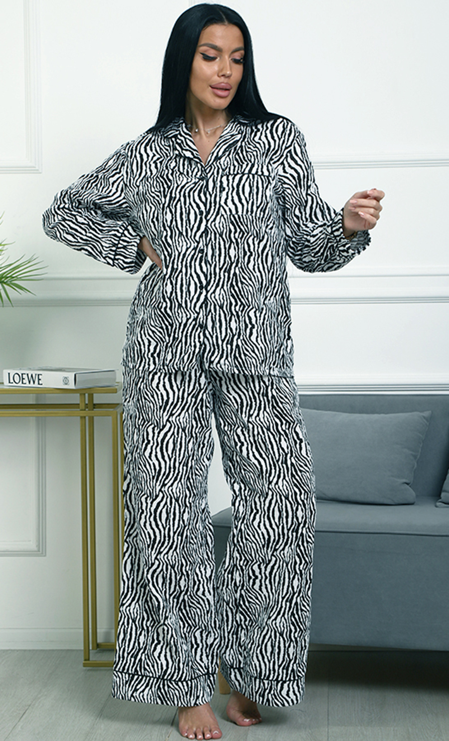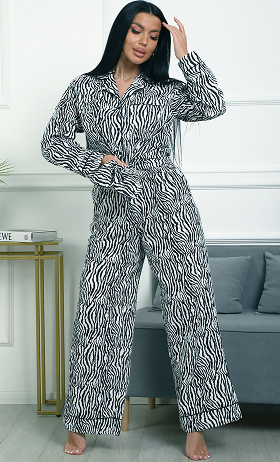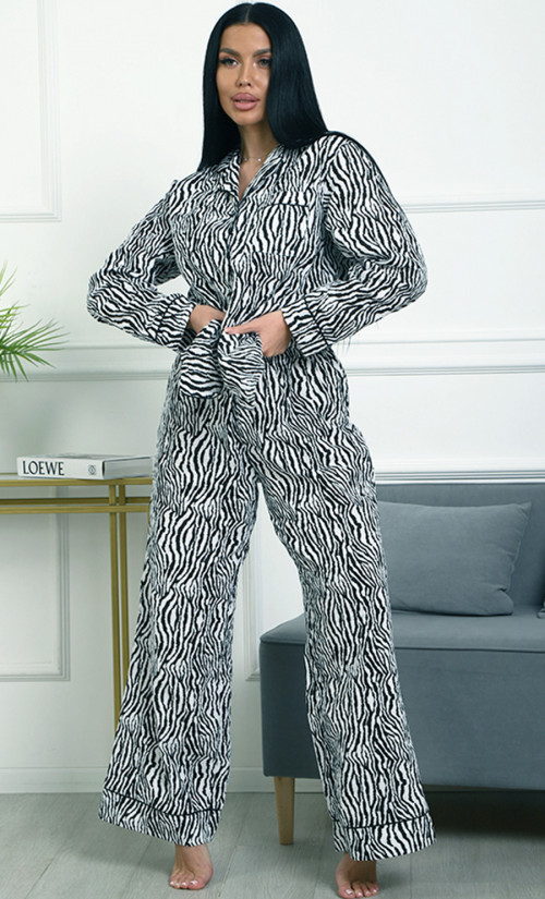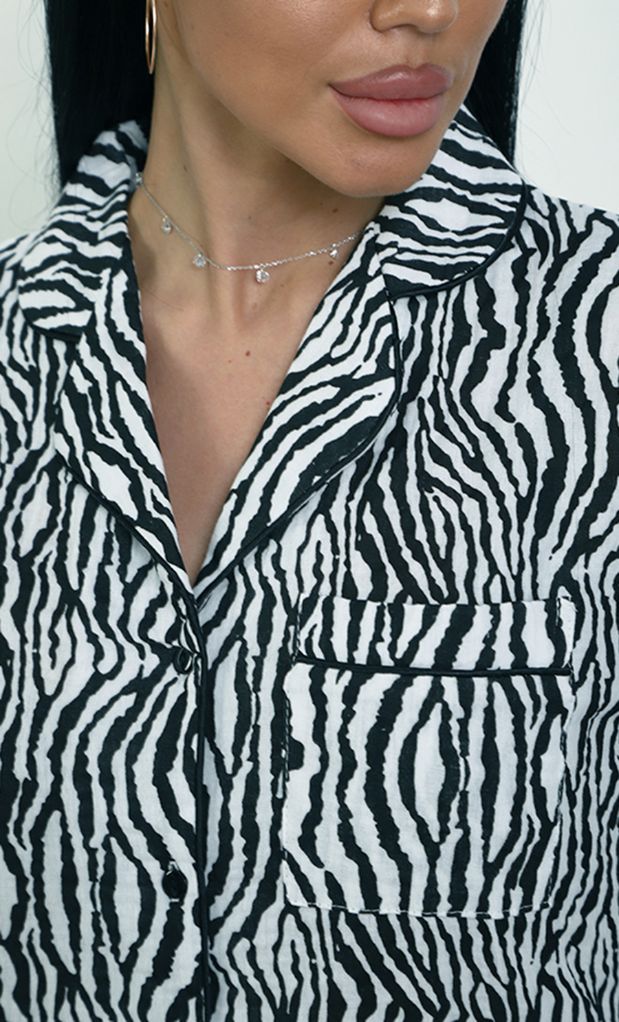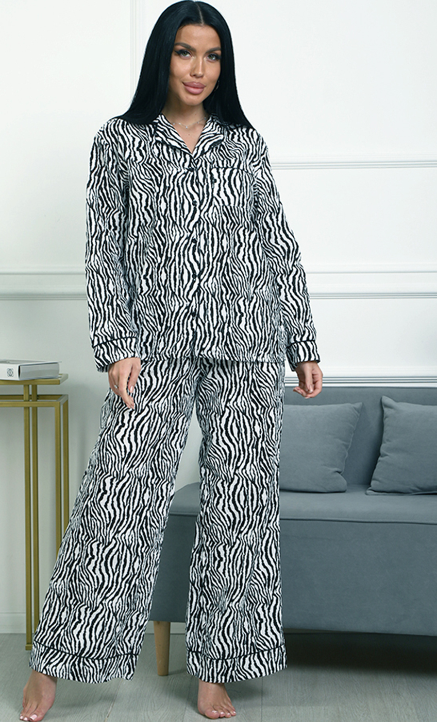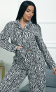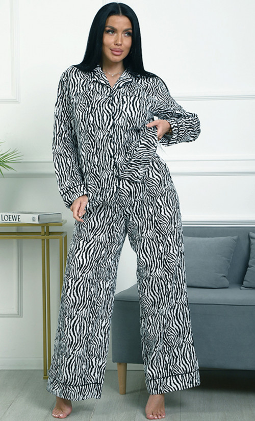 Пижама П-4700⁄2 выполнена из муслина 100% хлопка — лёгкого, мягкого и дышащего материала, обеспечивающего комфорт и уют. Модель с рубашкой на пуговицах и свободными широкими брюками создаёт расслабленный и стильный домашний образ. Яркий зебровый принт придаёт пижаме динамичность и выразительность.