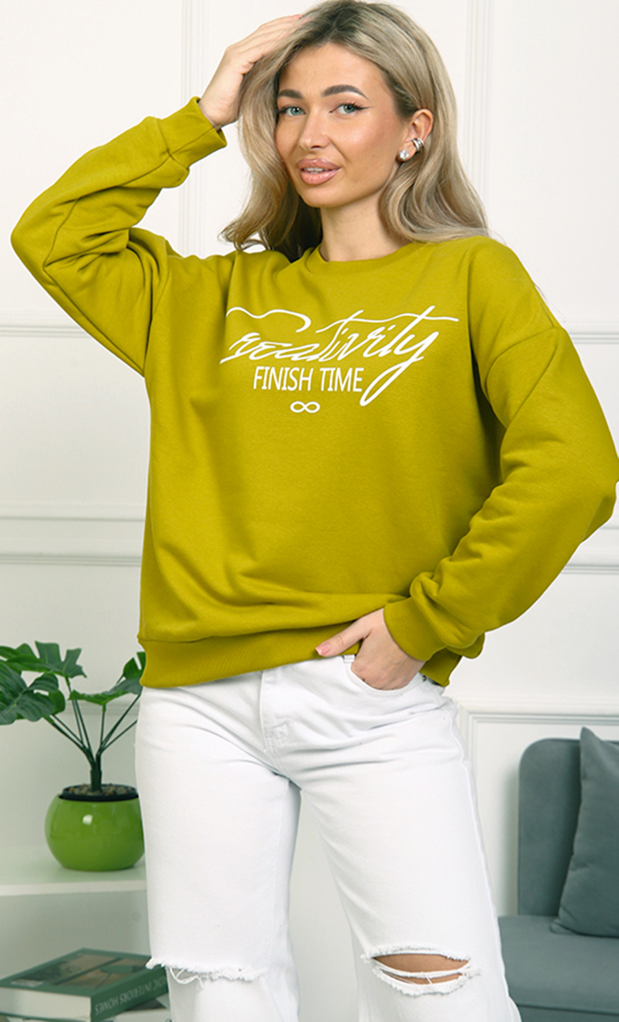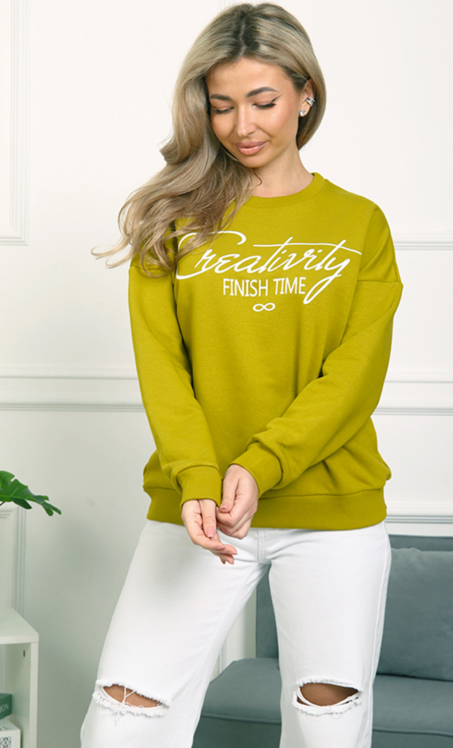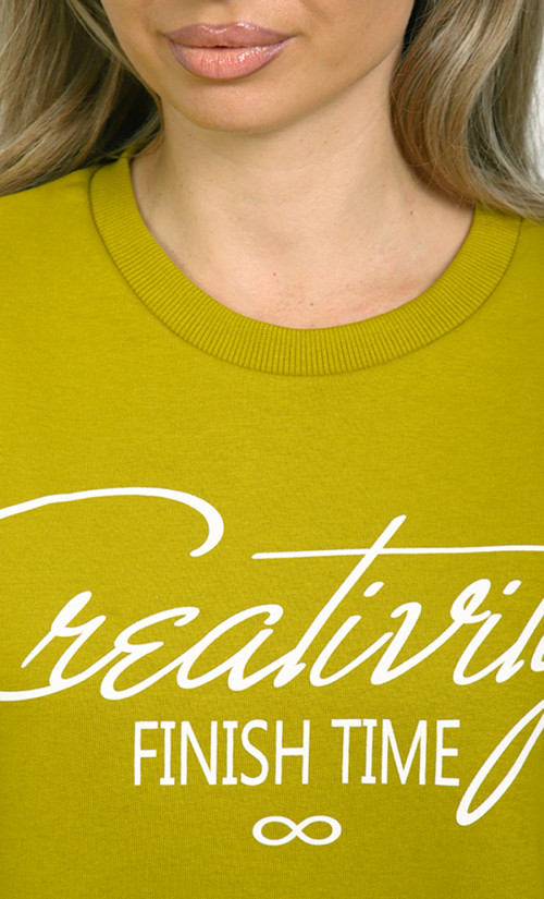 Толстовка БК-4807 / 2 выполнена из футера 3-нит петля (96% хлопок, 4% лайкра) — мягкого, эластичного материала, обеспечивающего комфорт и хорошую посадку. Свободный крой со спущенными плечами и эластичные манжеты создают уютный и стильный образ. Надпись “Creativity Finish Time” добавляет изделию модный акцент.