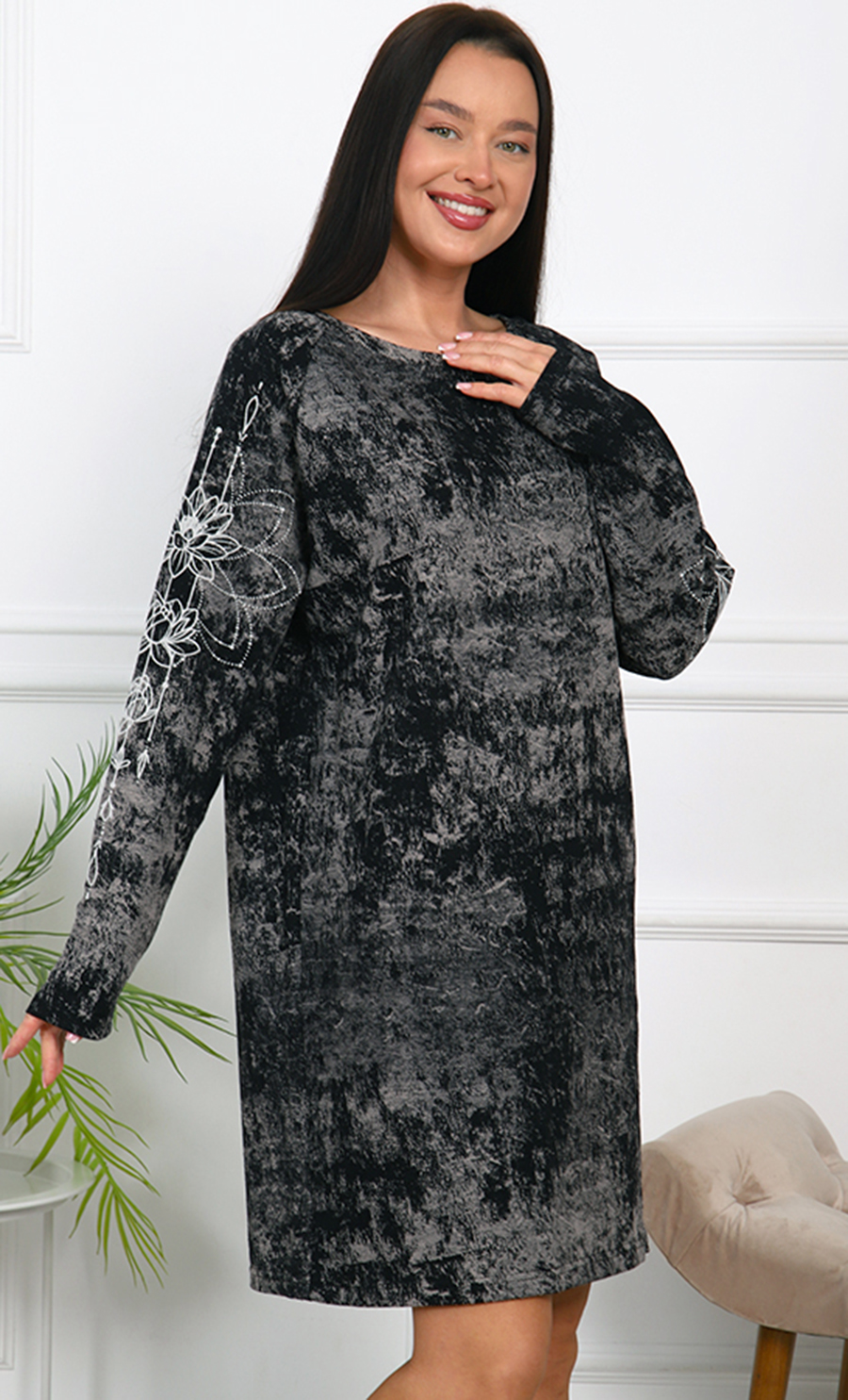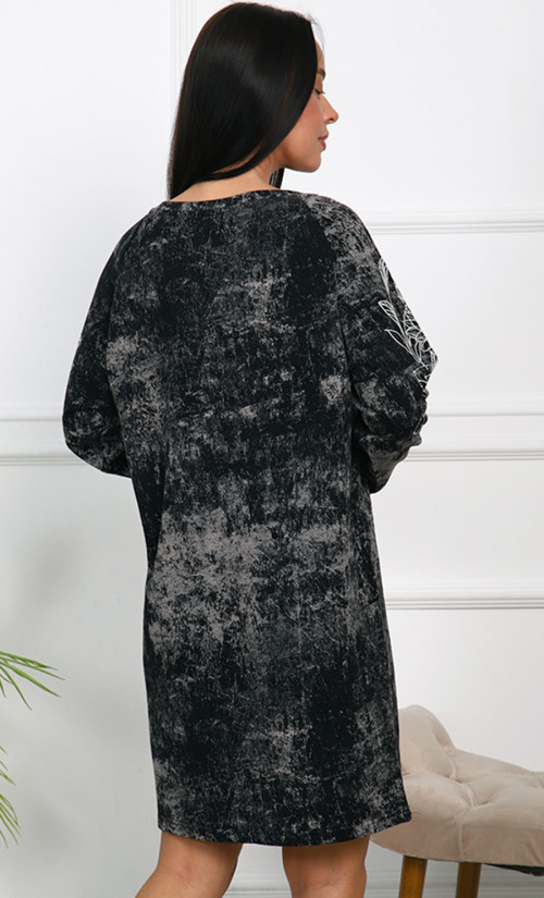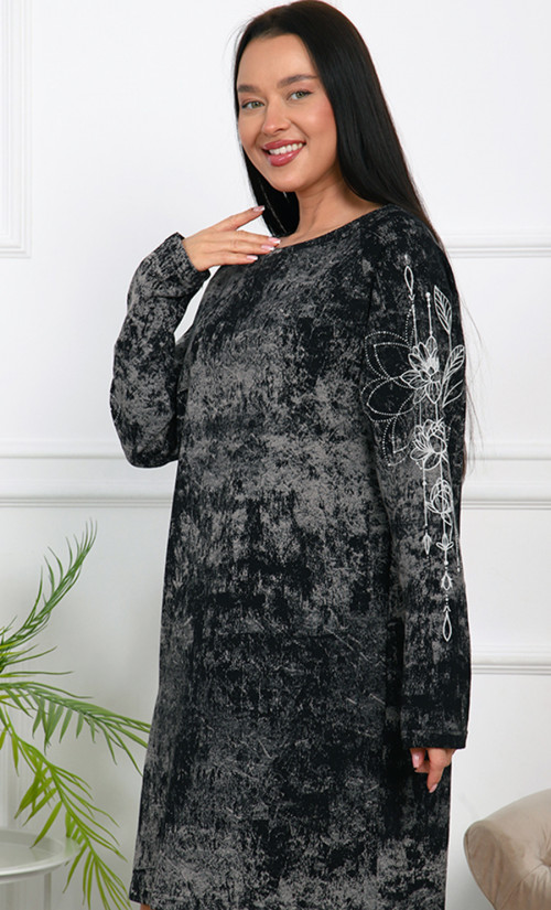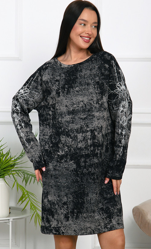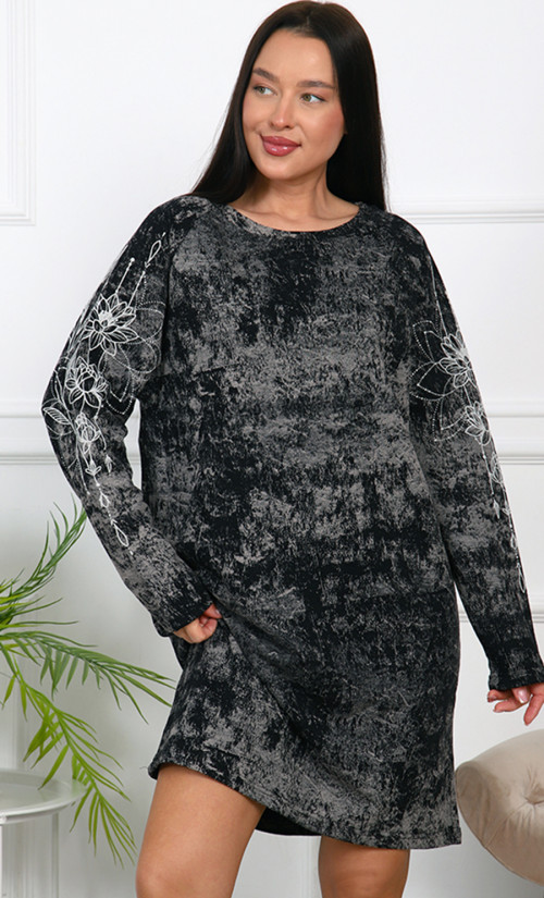 Туника Т-4791 / 2 выполнена из футера 2х-нитка, 100% хлопка — натурального, мягкого и дышащего материала, обеспечивающего комфорт и тепло. Свободный крой с длинными рукавами и длина ниже колена создают стильный и уютный образ. Оригинальная белые узоры на рукавах добавляет изящества и индивидуальности.